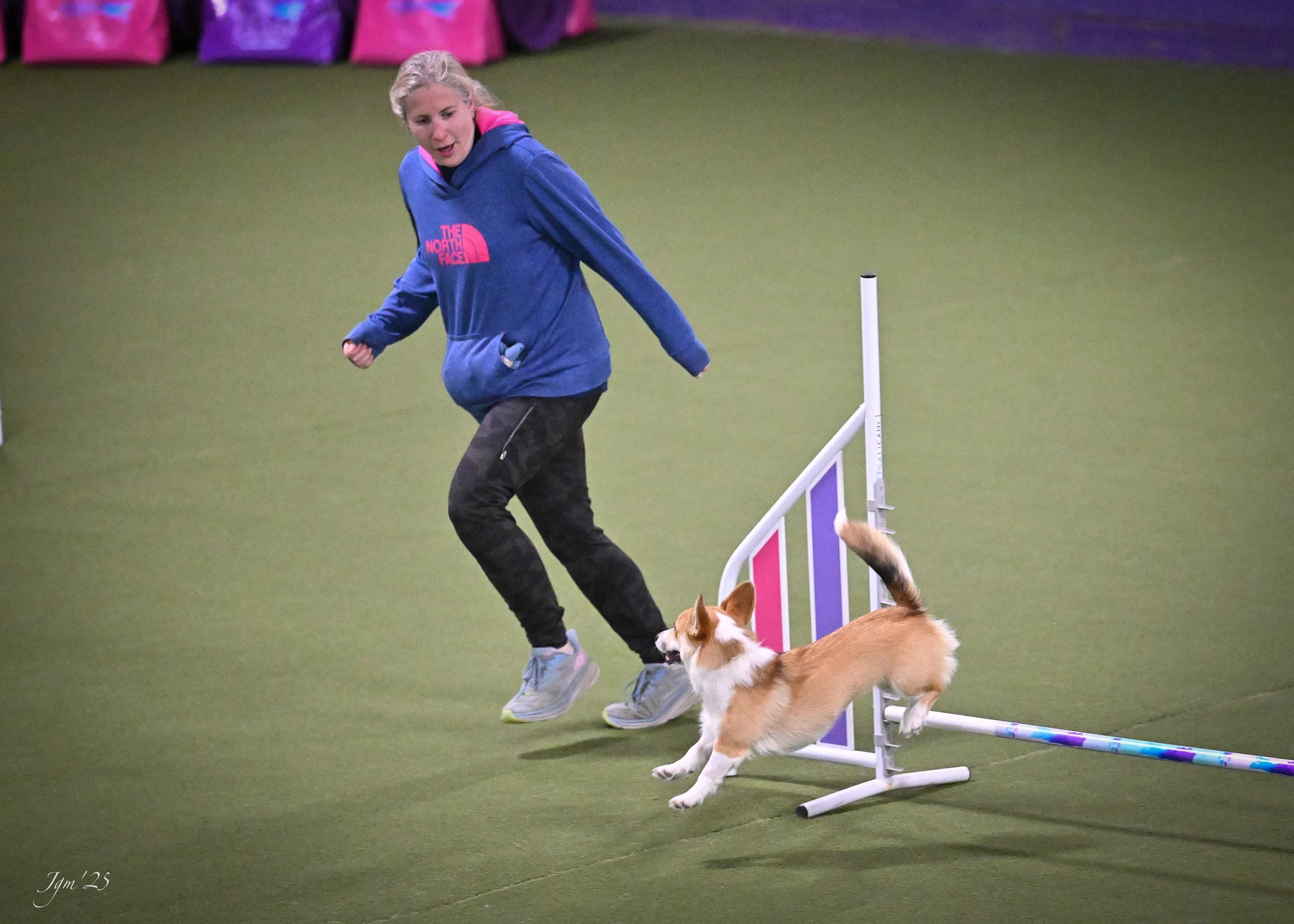 In this class we work on full length (20 obstacle) sequences. Every week, we walk the course, analyze handling choices, and then each team gets two three minute turns to work the sequence and train through new challenges. Each month, competition classes work on a new subject. Subjects covered include: tight turns, independent contacts, distance handling, using toys to reinforce, how to decide which cross to use, warm up routines, independent weaves, how to build speed, proofing distractions, lead outs, and more!